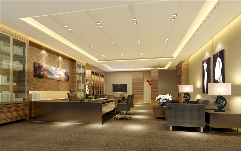 2)辦公室也可以給人的是一種高檔、豪華的感覺。白色的石膏板吊頂搭配黃色的微晶石背景墻顯得非常的和諧,整個辦公室在暖黃色的燈光照耀下顯得非常的奢華,大氣,展現(xiàn)出公司的實力。