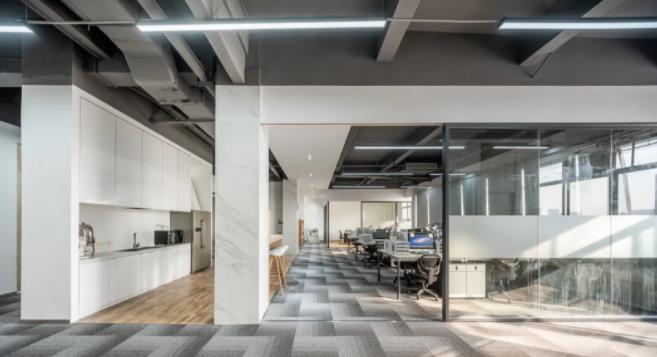 2、協(xié)作與可持續(xù)理念相結(jié)合的開放式辦公室設(shè)計:天花設(shè)計富有特色,由白色穿孔金屬板彎折出具“通風(fēng)”功能的裝飾吊頂。光澤的金屬質(zhì)感與粗獷的黑色原始建筑頂面形成強烈的視覺反差。新舊的對比、色彩的對比、質(zhì)感的對比、簡練的設(shè)計結(jié)合當(dāng)下潮流靈動辦公理念,成功塑造出一個具專業(yè)氣質(zhì)的時尚辦公空間。