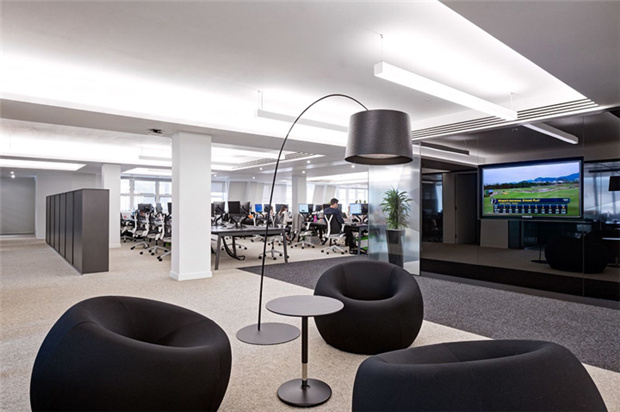 4、某知名品牌投資管理公司辦公室裝修:開放辦公區(qū)域作為整體員工工作區(qū)域,保證員工舒適性,提高工作效率,天花黑格吊頂,天花用暖色的燈裝飾,地面沒有過多的造型,整體營造的氛圍很和諧。辦公室休閑區(qū)設(shè)計:明朗的色調(diào),具有開放式的格局,員工置身于靈動的環(huán)境下,思維打開,工作效率極高。
